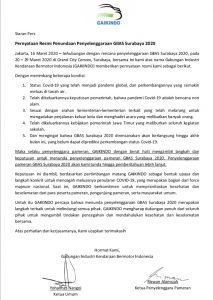 Maka selaku penyelenggara pameran, GAIKINDO dengan berat hati mengambil langkah dan keputusan untuk menunda penyelenggaraan pameran GIIAS Surabaya 2020.