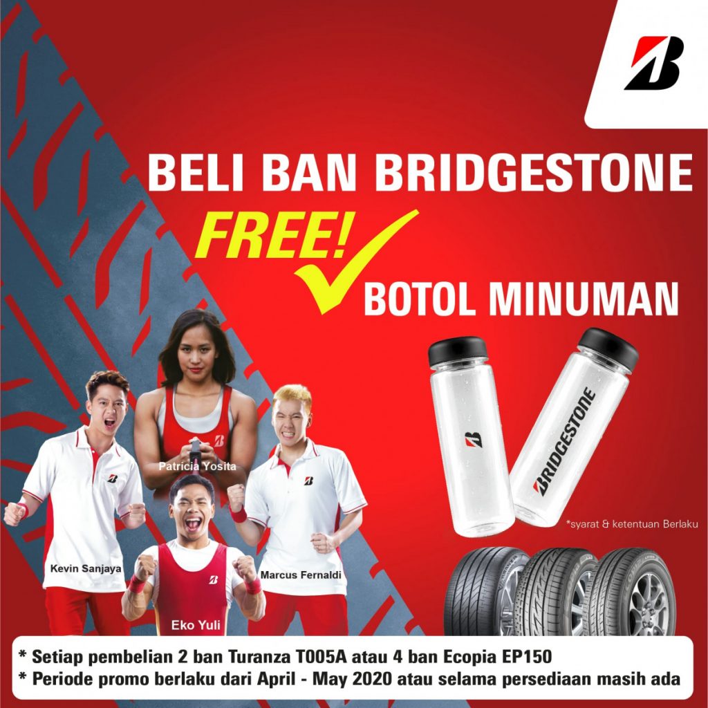 Dalam promosi yang berlaku mulai 1 April hingga 31 Mei 2020 ini setiap pembelian dua ban Bridgestone tipe Turanza T005A atau empat ban Bridgestone tipe Ecopia EP150 pelanggan akan mendapatkan sebuah botol air minum Bridgestone edisi terbatas selama persediaan masih ada.