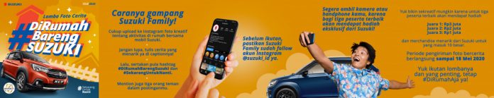 Dalam kompetisi #DiRumahBarengSuzuki, warganet diajak untuk menginspirasi orang lain melalui kegiatan-kegitan positif di rumah selama masa pandemi ini. Bagi warganet pengguna mobil Suzuki, dapat mengikuti kompetisi ini dengan mengunggah foto kreatif saat beraktivitas di rumah bersama mobil Suzuki ke akun Instagram masing-masing dengan menyertakan tagar #DiRumahBarengSuzuki dan #SekarangUntukNanti dan mention akun Instagram Suzuki mobil @suzuki_id.