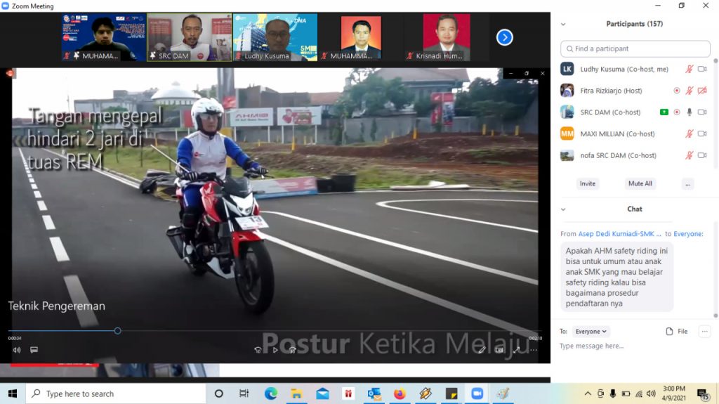 Safety Riding Development Section Head PT DAM, Ludhy Kusuma Robby mengatakan, “Aktifitas Webinar safety riding ini dilakukan untuk menambah wawasan dan pengetahuan kita dalam keselamatan berkendara di jalan raya yang aman dan nyaman, termasuk menjadikan #Cari_Aman sebagai lifestyle dalam keseharian.”