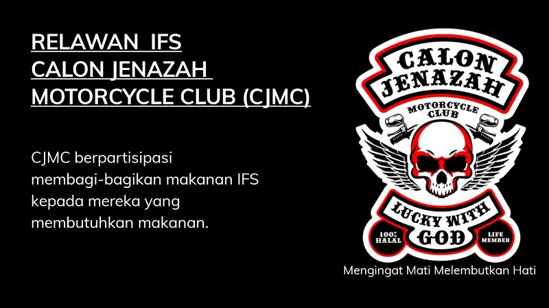 Turut hadir sejumlah bikers dari komunitas Calon Jenazah Motorcycle Club (CJMC). Hingga saat ini, CJMC menjadi relawan resmi IFS yang aktif membagi-bagikan paket makanan IFS, baik di jalan maupun di panti-panti asuhan.