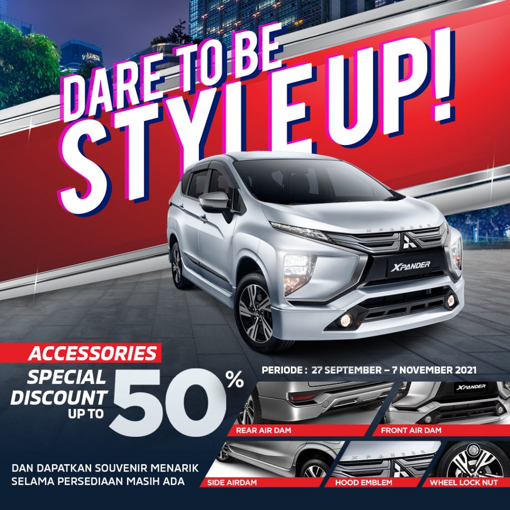 Potongan harga hingga 50% khusus konsumen model kendaraan Xpander semua varian yang melakukan pembelian aksesoris baik paket maupun satuan. Potongan hanya berlaku untuk pembelian item aksesoris sebagai berikut: