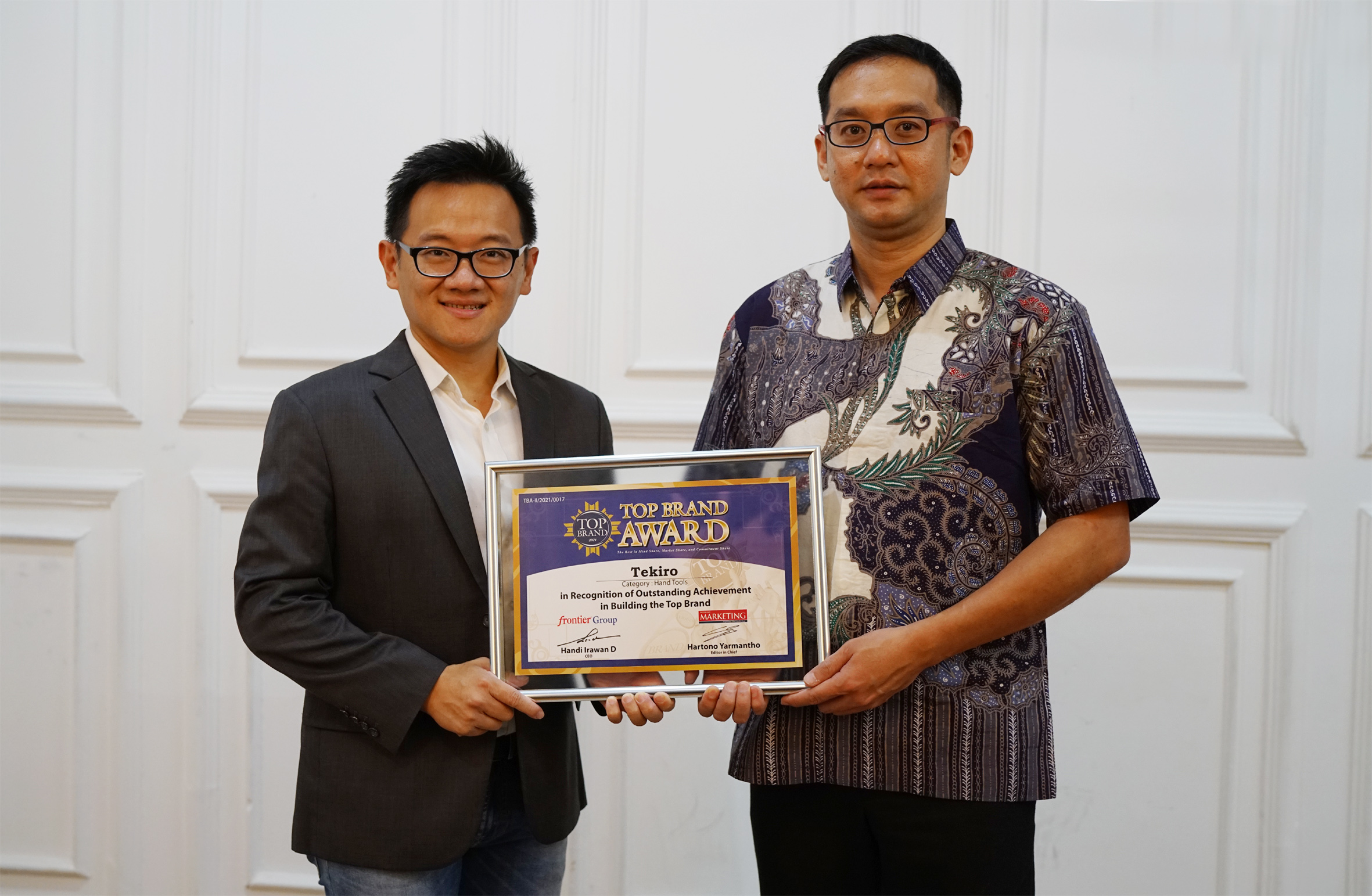 Pengendara.com-Penghargaan Top Brand 2021 untuk Tekiro secara langsung diberikan oleh Brian Hendrata, Managing Director Frontier kepada Stephanus Santoso, Wakil Presiden Direktur Tekiro. Mengingat masih diberlakukannya pembatasan aktivitas akibat pandemi Covid-19, penyerahan sertifikat Top Brand Award 2021 dilakukan di salah satu studio di kawasan Darmawangsa, Jakarta Selatan.