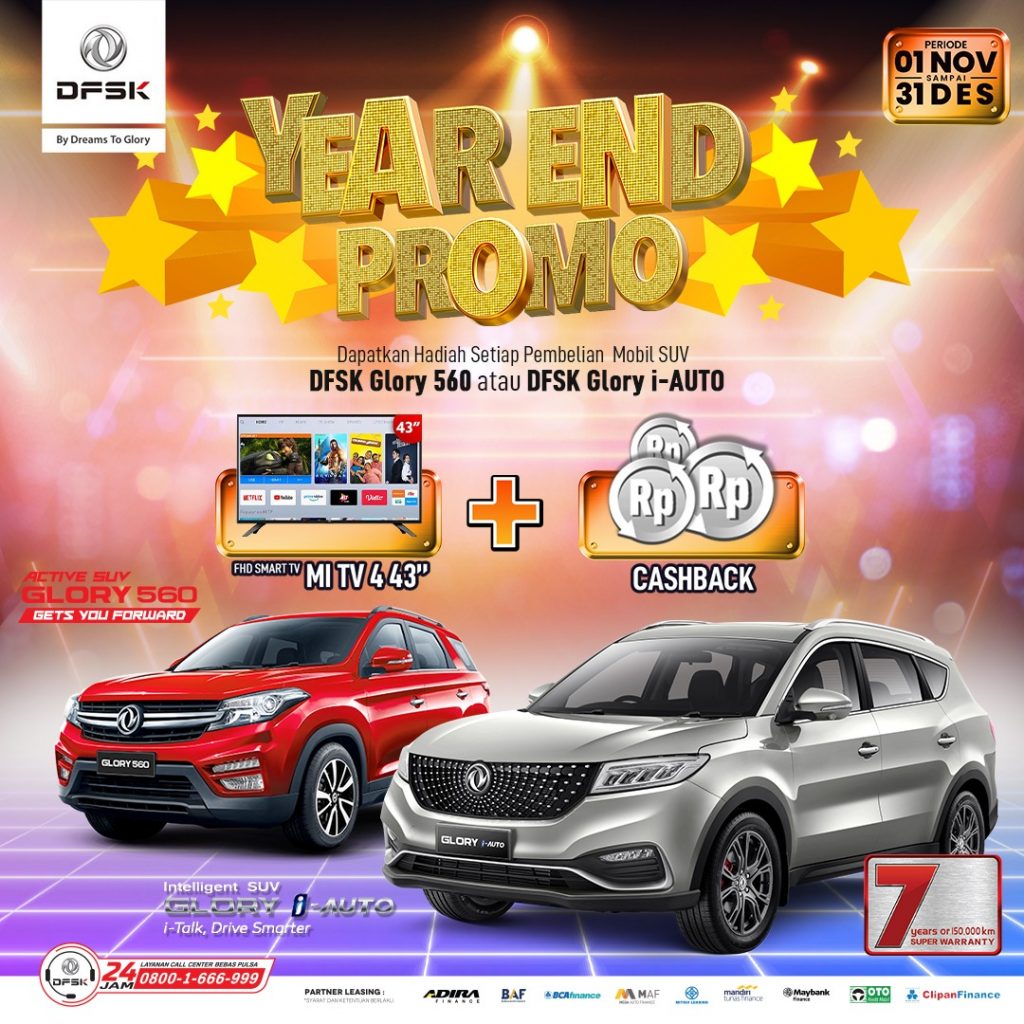 Kendaraan-kendaraan DFSK dengan segala keunggulan dan berkualitas bagi konsumen di Indonesia, dan semakin nyaman dengan adanya Year End Promo. DFSK Glory i-AUTO ditawarkan sebesar Rp 360 juta, dan DFSK Glory 560 sudah bisa di bawa pulang dengan mahar dari Rp 202,5 juta (on the road DKI Jakarta) atau cicilan per bulan Rp 3,7 juta saja. Selain penawaran yang menarik, konsumen akan ditawarkan angsuran ringan per bulannya serta hadiah langsung berupa smart tv berukuran 43 inci dan cashback senilai jutaan rupiah.