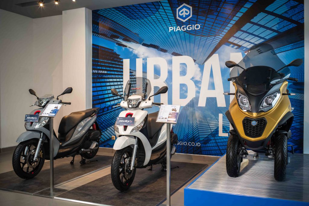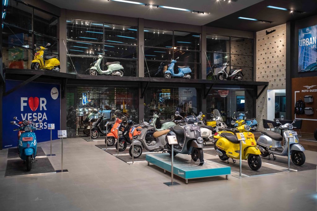 Selain itu terdapat fasilitas yang terdiri dari showroom premium seluas 330m2 yang menampilkan berbagai rangkaian produk menarik mulai dari Piaggio, Vespa, Aprilia, dan Moto Guzzi serta display aksesoris asli serta tempat parkir yang luas.