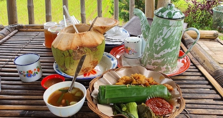 Menu yang disajikan adalah makanan khas Sunda yang diracik dengan bumbu rempah khas Nusantara seperti sayur asem, ikan gurami, ayam bakar, karedok, tutug oncom, hingga peda bakar. Sedangkan minumannya ada es kalapa ting ting, es kalapa gelas, es kapuk, es jeruk, lemon tea hingga aneka jus dengan harga yang terjangkau.