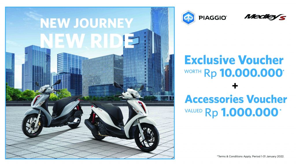 Pengendara.com-Penawaran tersebut berupa Exclusive Voucher senilai Rp10 juta ditambah dengan aksesori voucher Rp1 juta khusus pembelian Piaggio Medley S ABS pada periode ini.