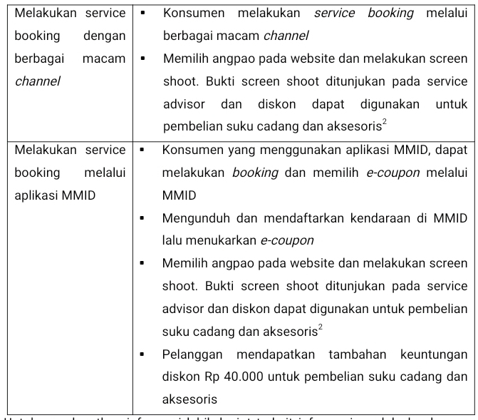 Diskon 5% – 20, atau diskon maksimal Rp 200.000 untuk pembelian suku cadang dan aksesoris ≥ Rp 1.000.0001, serta