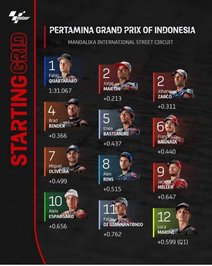 Fabio Quartararo namanya booming di udara setelah memperoleh waktu tercepat dengan 1:31.067. Quartararo berhasil menduduki posisi pertama. Urutan kedua ditempati Jorge Martin 1:31.280. Posisi kedua ini juga disaingi oleh Johano Zarco. Sementara posisi 4 ada Brad Binder dengan catatan waktu 1.31.433 menit. Sedangkan ke-5 ada E. Bastianini yang pada MotoGP Qatar berhasil menjadi juara. Sedangkan Marc Marquez harus merelakan posisi ke-15. Ia mengalami crash di kualifikasi MotoGP Mandalika