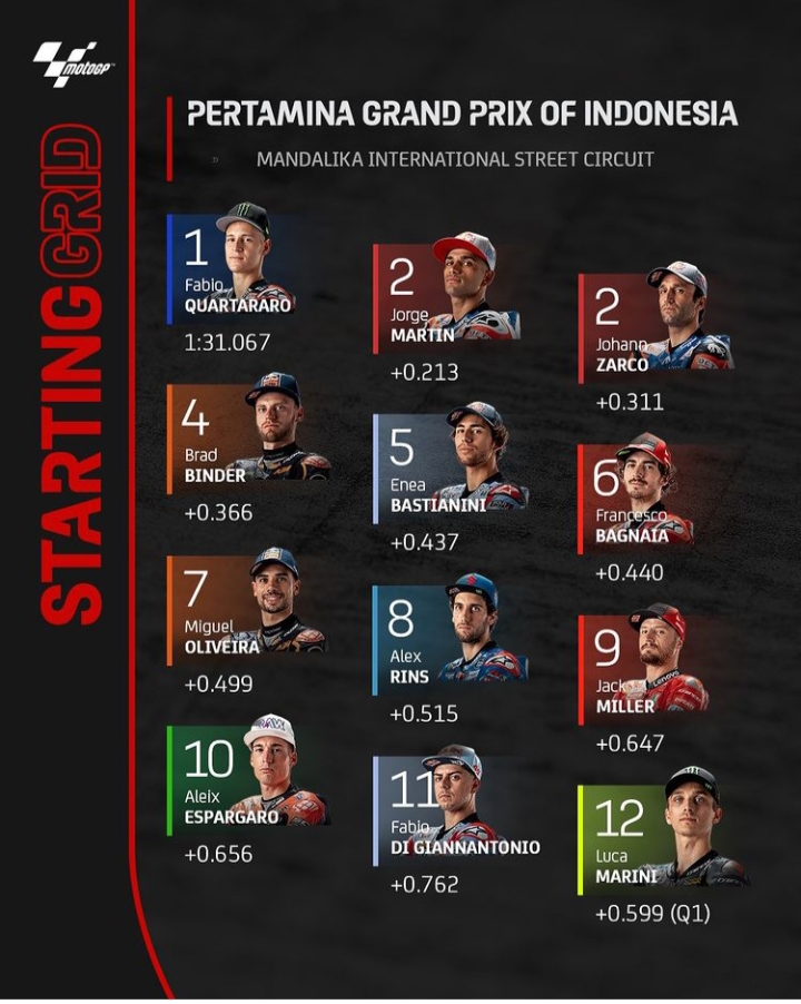 Saatnya hari ini para pebalap dunia itu akan mempertarungkan namanya di ajang MotoGP. Namun ada berita gembira pebalap muda Honda, Mario Aji berhasil menjuarai posisi ke-3 di kualifikasi. Sehingga pria berkulit putih ini start di posisi 3 hari ini.