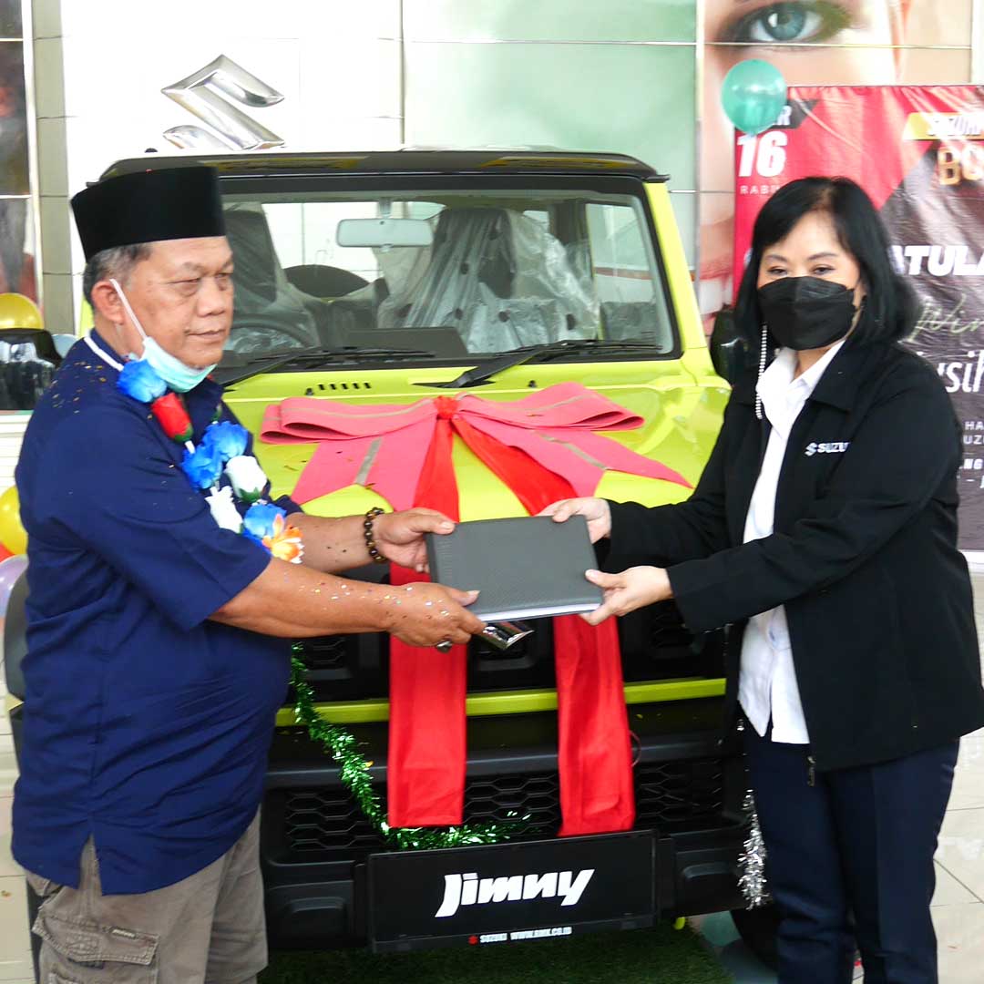 “Kami mengucapkan selamat kepada Bapak Jusih yang beruntung mendapatkan hadiah satu unit Jimny setelah melakukan pembelian satu unit New Carry Pick Up di dealer RMK Karawang. Untuk masyarakat yang ingin mendapatkan hadiah menarik lainnya dari Suzuki, jangan lupa untuk terus mengikuti setiap program promosi yang diadakan Suzuki. Sekali lagi kami ucapkan terima kasih kepada seluruh pelanggan Suzuki atas antusiasme dan tingginya minat pelanggan dalam mengikuti program Suzuki Bonus Suzuki yang hadir dalam menyambut kebahagiaan di tahun yang baru,” jelas Sukma Dewi, Asst. to Dept. Head Sales 4W PT SIS.