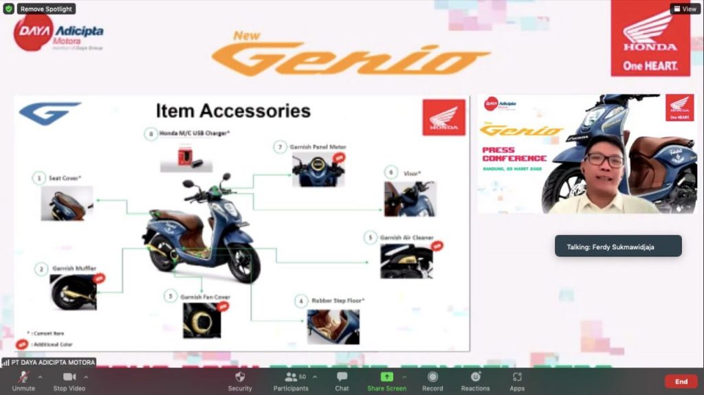 General Manager Parts Sales, Marketing, & Logistic PT Daya Adicipta Motora, Ferdy Sukmawidjaja mengatakan guna melengkapi gaya berkendara bersama New Honda Genio kami juga menyediakan beragam aksesories dan apparel yang stylish dan berkualitas tinggi.