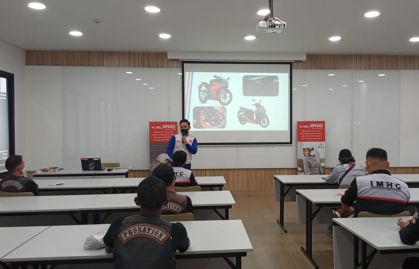 Pengendara.com-Sebanyak 20 bikers yang berasal dari berbagai komunitas sepeda motor Honda dibawah naungan IMHC mendapatkan pembekalan safety riding baik secara teori maupun praktek. Materi yang diberikan berupa teori dasar berkendara dan touring kemudian dilanjutkan dengan sesi praktek safety riding pada pengereman, slalom course, dan narrow plank.