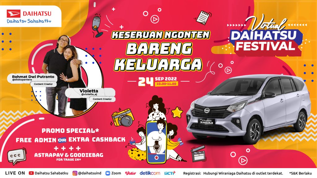 Pengendara.com, Jakarta — Daihatsu mengajak pelanggannya menikmati akhir pekan sambil seru seruan bikin konten bareng keluarga di acara Virtual Daihatsu Festival yang diadakan pada Sabtu (24/9) pukul 10.00 – 11.00 WIB.