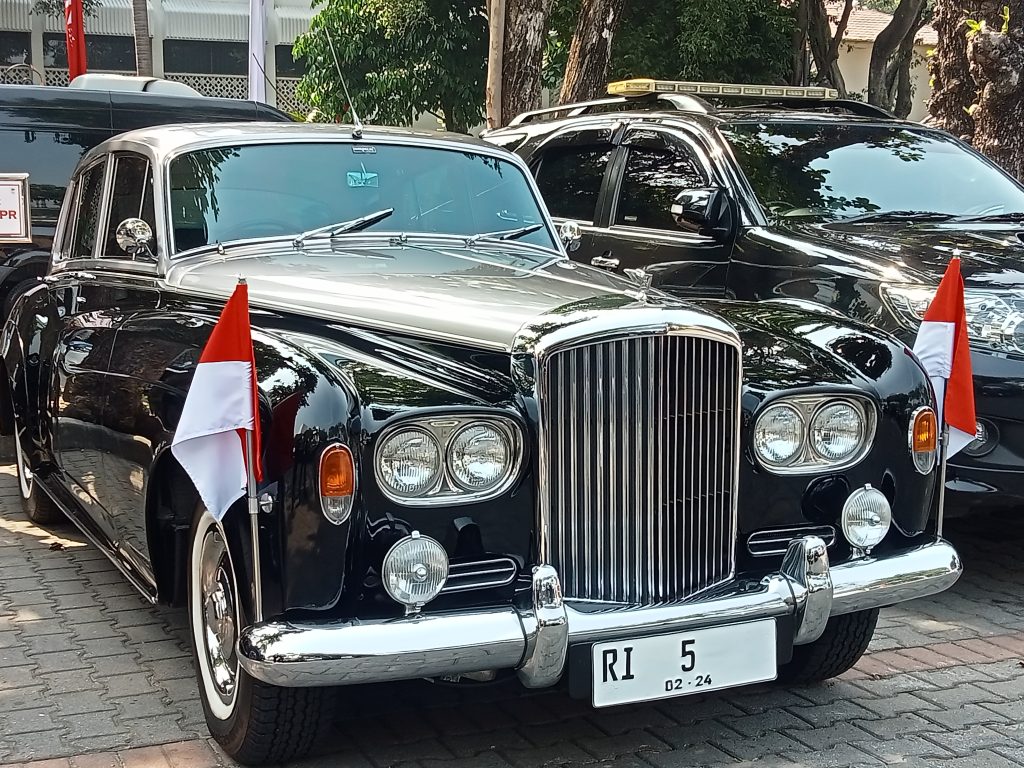 Pengendara.com-Mobil Bentley tersebut terlihat di parkiran jajaran para tamu tamu VIP Istana Presiden. Uniknya lagi di mobil klasik ini dipasangkan tiang bendera dan bendara merah putih di sisi kiri dan kanan depan Bentley seri S3 Continental Flying Spur. Mobil ini memakai pelat nomor polisi RI 5 dengan pelat dasar putih, tulisan berkelir hitam. Yang diparkirkan sejajar dengan mobil Menteri dan para tamu VIP lainnya di parkiran khusus Istana Presiden.