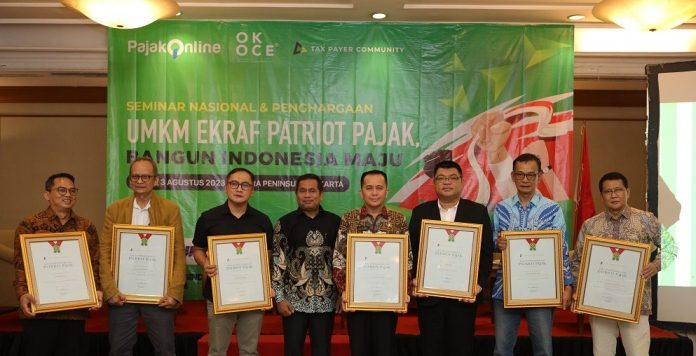 Anugerah Penghargaan Patriot Pajak diberikan Tax Payer Community dalam rangkaian acara Seminar UMKM Ekraf Patriot Pajak, Bangun Indonesia Maju di Menara Peninsula, Jakarta, Kamis (3/8/2023). Ratusan peserta yang hadir dalam acara Seminar Nasional UMKM Ekraf Patriot Pajak, Bangun Indonesia Maju ini adalah perwakilan pelaku UMKM, perhimpunan, asosiasi, ikatan, dan komunitas para pembayar pajak.