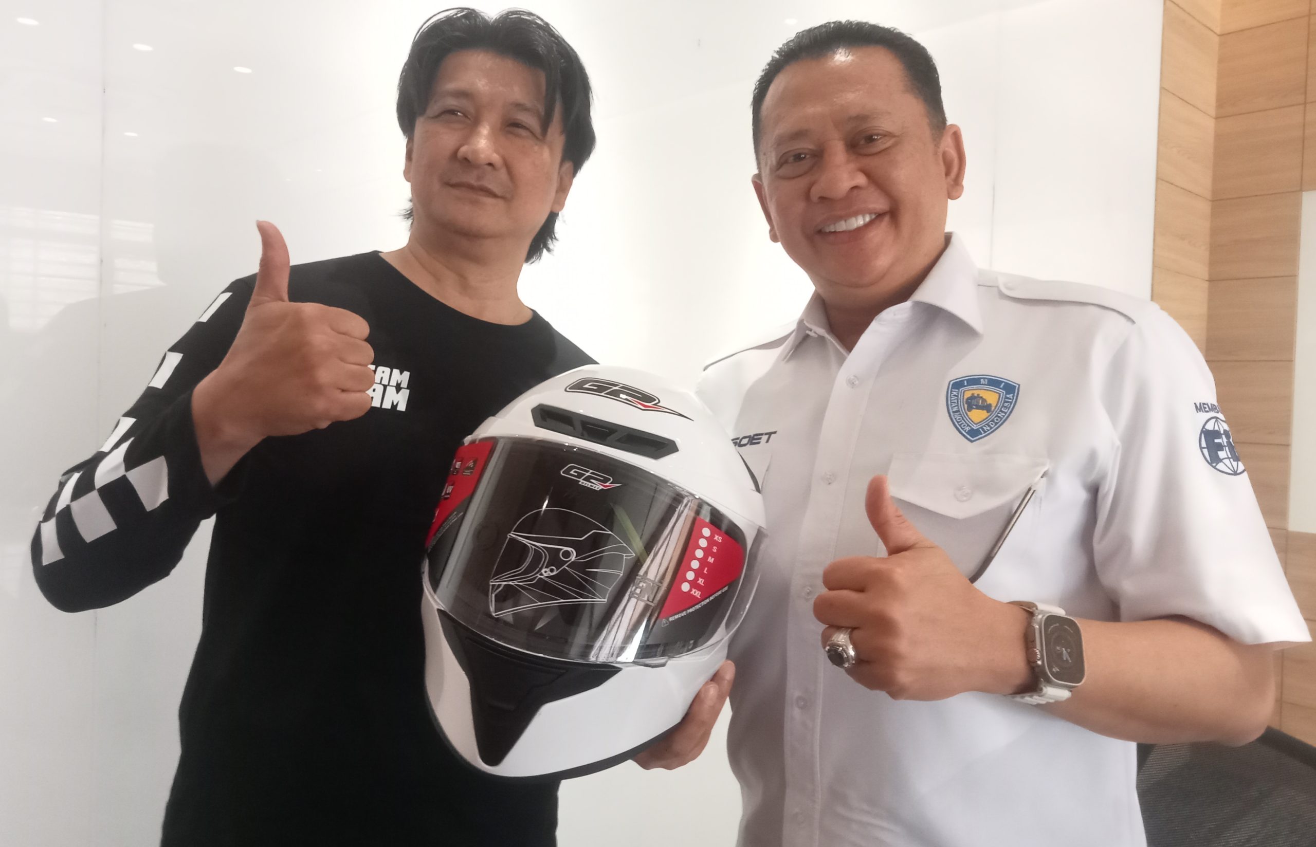 Saat menerima helm G2 Prestige, Bambang Soesatyo (Bamsoet), Ketua MPR RI dan Ketua Umum PP IMI berterima kasih kepada helm G2, PT Poliprima Cipta Unggul (PCU).