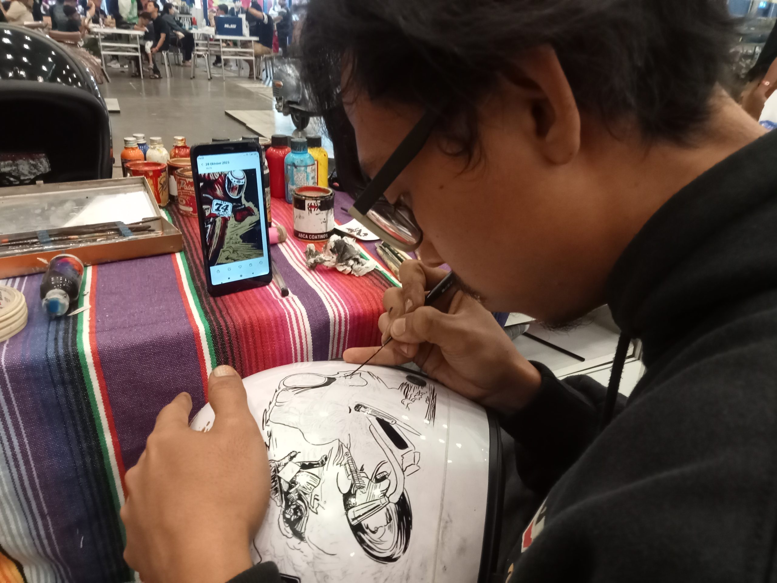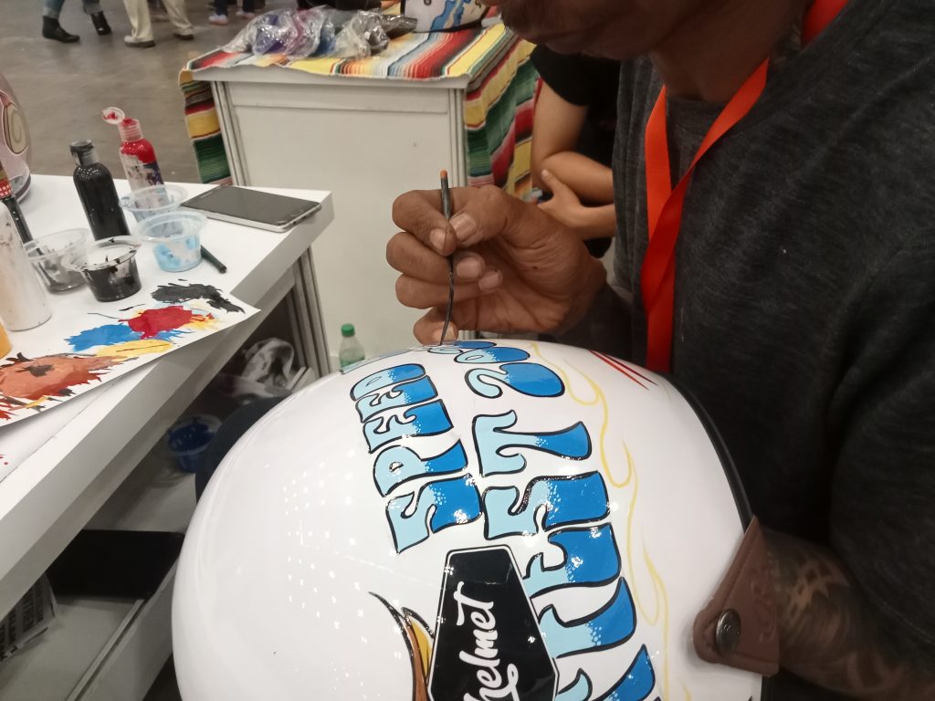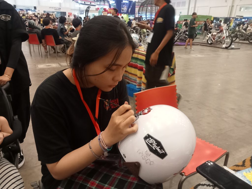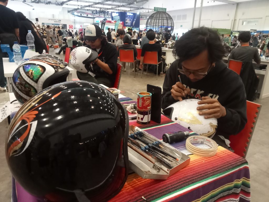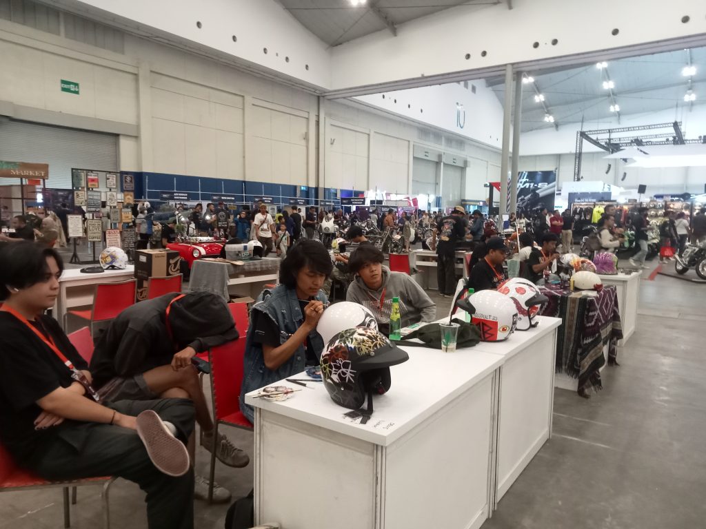 Indonesia Motorcycle Show (IMOS) 2023 digelar selama lima hari, mulai 25 hingga 29 Oktober 2023. Hari Sabtu, 28-29 Oktober 2023 diwarnai dengan Motobuiltfest Speed and Garage. Di sini berbagai acara dipersembahkan, dari modifikasi motor, edukasi dan lain sebagainya hingga grafiti helm. Helm helm tersebut dibubuhi grafis bahkan lukisan dari coretan kuas. Mereka sangat kreatif. Berikut galeri fotonya.