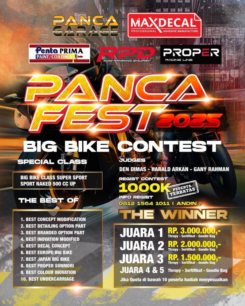 Kegiatan ini pada 13 – 15 Juni 2025, Berlokasi di BrickHall Fatmawati, City Center, Jakarta Selatan. Selain menampilkan kreativitas para modifikator, dalam gelaran kontes modifikasi motor ini Panca Fest 2025 menghadirkan konsep yang lebih berani dengan seperti dibukanya Special Class Big Bike untuk moge dan khusus Harley Davidson.